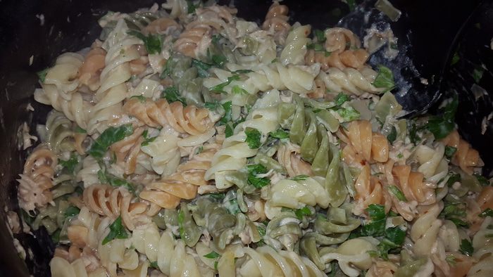 Добавляем в сливочный соус пасту и петрушку, перемешиваем и прогреваем под крышкой 5 минут. Подаем с овощами. Приятного аппетита!