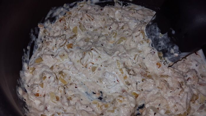 Пасту откидываем на дуршлаг, перекладываем лук с чесноком и тунцом в кастрюлю в которой варилась паста и добавляем сливки. Перемешиваем, прогреваем.