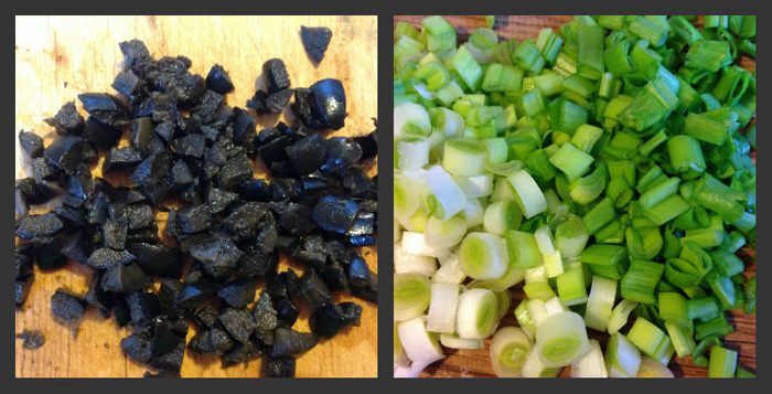 Маслины и зелень мелко порезать.