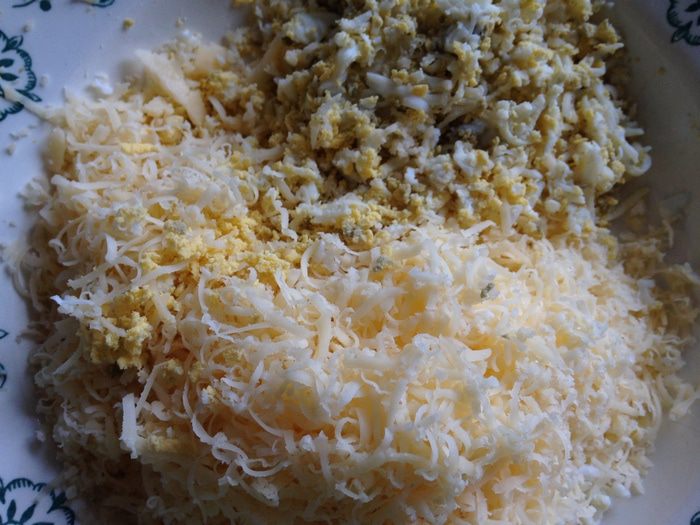Сыр и вареное яйцо натереть на мелкой терке.