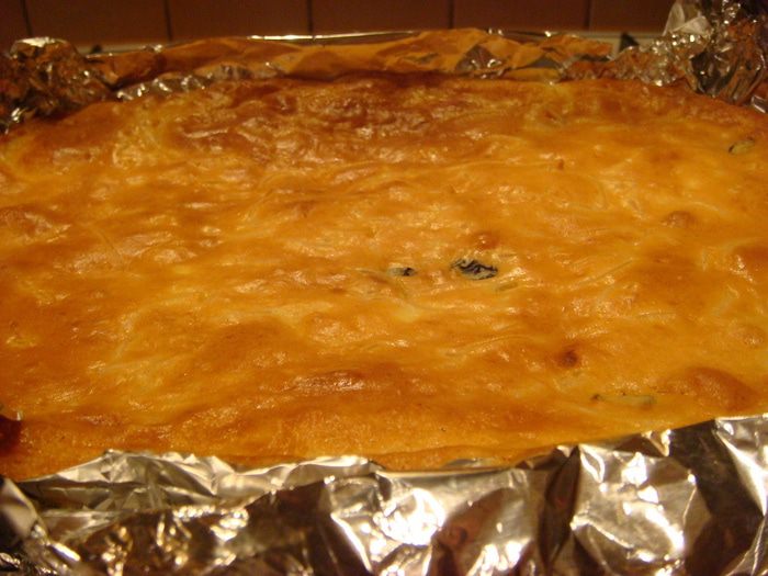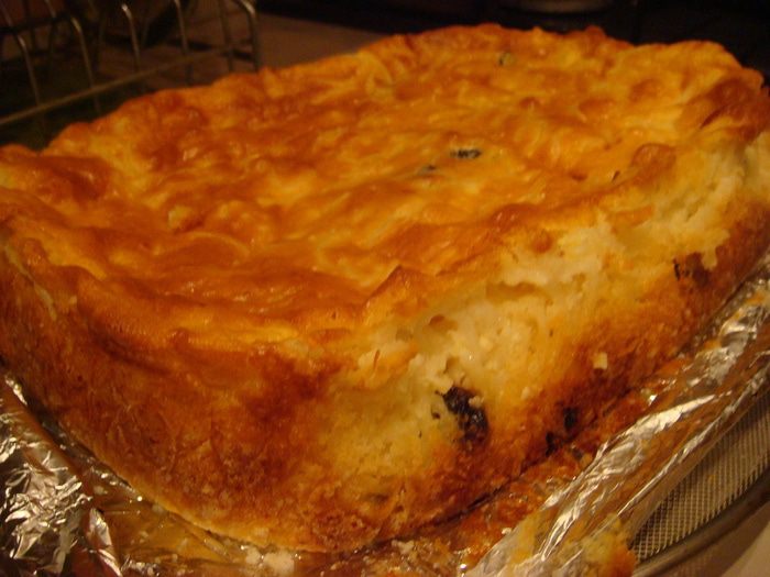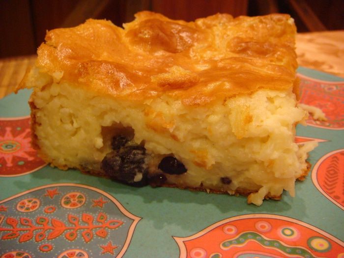 Творог перемешать погружным блендером до кремообразной консистенции+желтки+ сл.масло (растопленное)+муку, перемешать +вермишель+изюм+соду+ванилин перемешать.