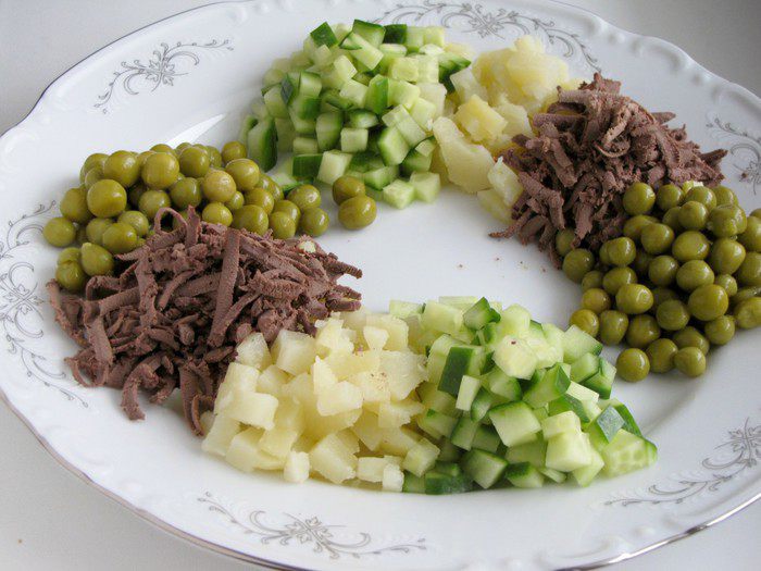 Количество ингредиентов даю приблизительное, так как все зависит от того, сколько будет едоков. ))) Главное - печени, огурца и картофеля должно быть в два раза больше, чем горошка, лука и укропа.