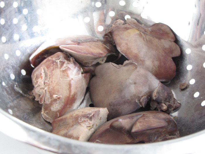 В подсоленной воде отварить печень до готовности, около 25 минут. Охладить.