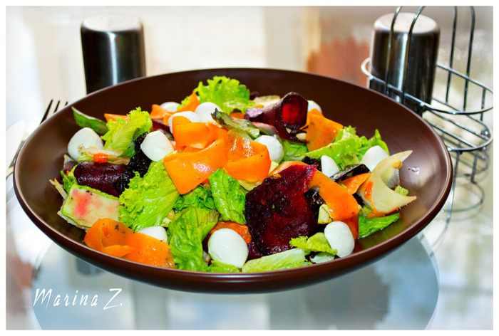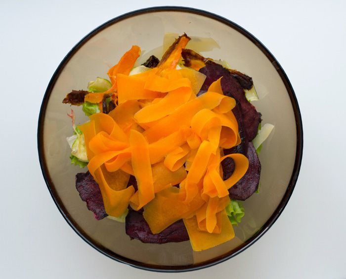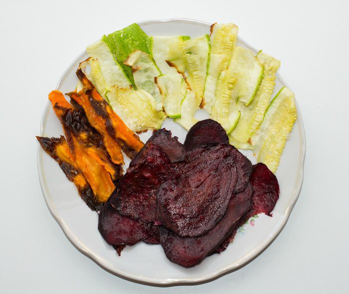 Приготовить овощные чипсы: свеклу, морковь, цукини тонко порезать, уложить на противень, смазать растительным маслом при помощи кисти (чуть-чуть). Посыпать морской солью.