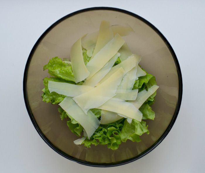 Листья салата измельчить на крупные фрагменты. Положить в глубокую емкость.