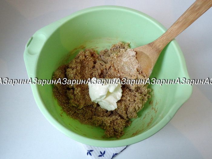 Всыпать сухие ингредиенты, перемешать. Добавить сметану и опять перемешать.