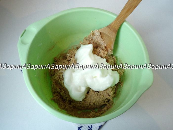 Белки взбить со щепоткой соли до мягких пиков и ввести в тесто.
