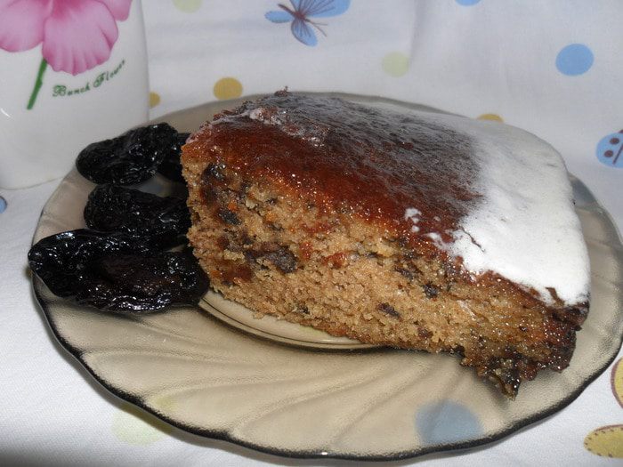 Смешать сухие и жидкие ингредиенты, добавить чернослив. Форму (у меня размер 25*25) хорошо смазать сливочным маслом, вылить тесто и выпекать 35-40 минут при температуре 150 С.