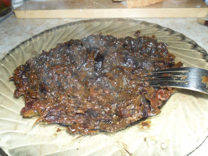 Чернослив залить водой, прокипятить 7-8 минут и растолочь вилкой в пюре.