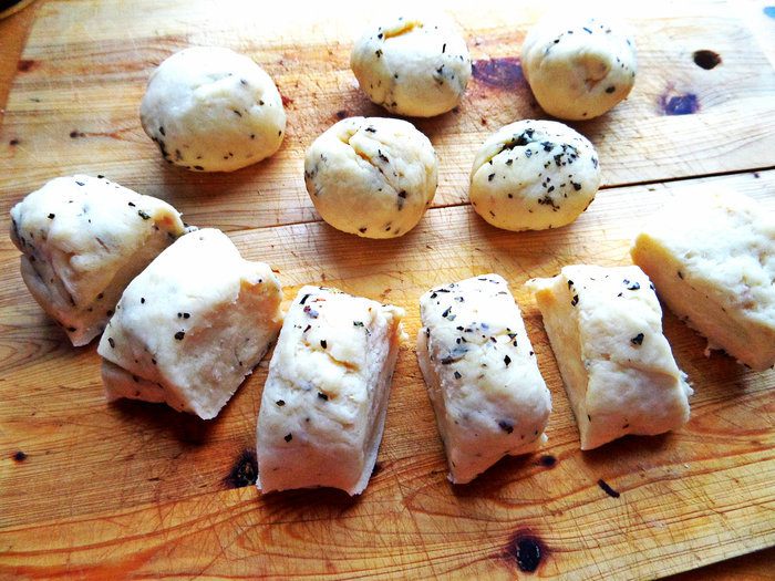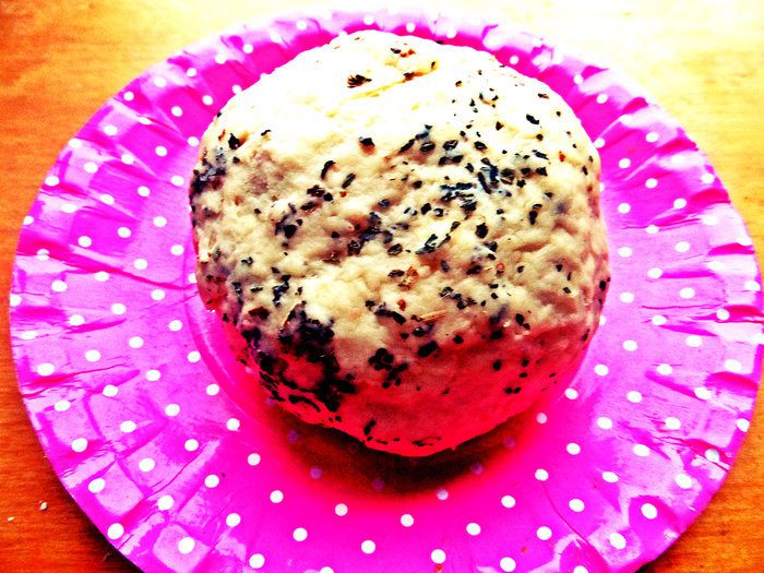 Теперь начинаем месить тесто рукой (муки уходит 85-95 г). Добавим любые приправы и соль,если требуется.