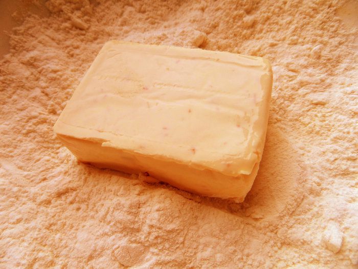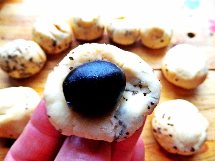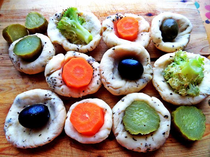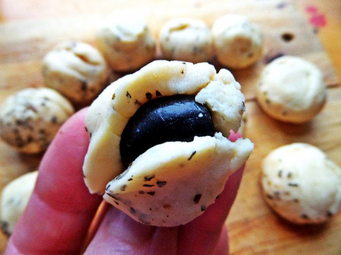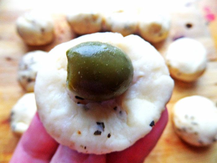 Каждый кусочек расплющиваем и в центр кладём начинку.