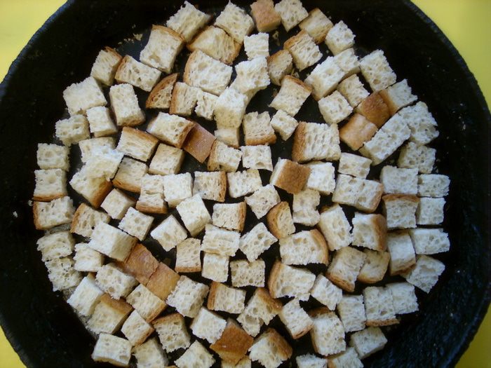 Хлеб нарезать на кубики и подсушить в духовке на медленном огне.