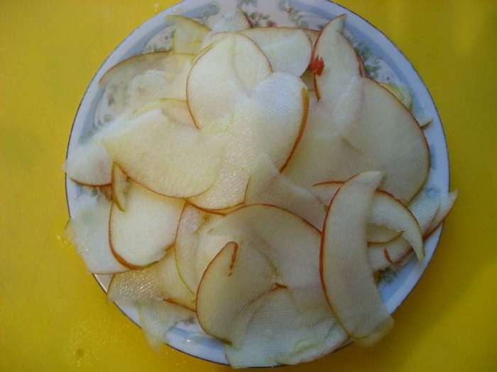 Взять кисло сладкое яблоко и нарезать дольками.