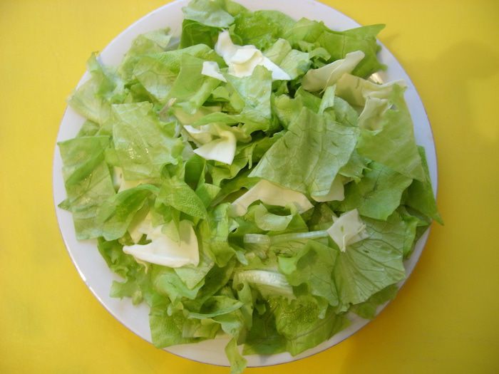 Листья салата нашинковать и посолить,смешать с курицей.