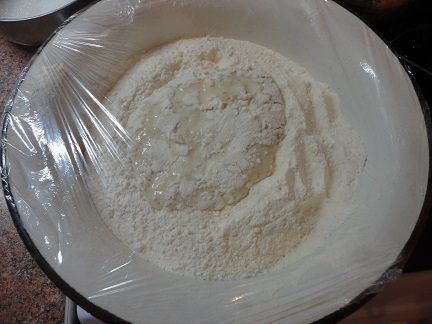 Муку просеять в миску. Сделать углубление. Отдельно в 100 г теплого молока развести дрожжи и добавить 3-4 ст. ложки муки. Опару вылить в углубление, сделанное в муке и присыпать мукой. Тесто закрыть пленкой и поставить на 30 минут в теплое место.