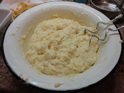 Подождать, пока на опаре появятся трещинки и добавить размягченное масло, яйца, сахар, ванильный сахар, соль и оставшиеся 200 г молока. Тесто вымешивать миксером 2-3 минуты, затем закрыть и на 30 минут поставить в теплое место.