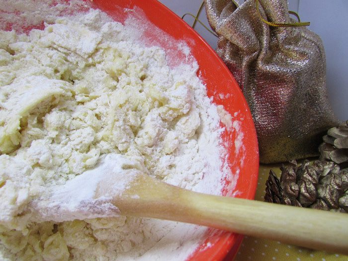 Всыпать 200 грамм муки с разрыхлителем и замесить мягкое тесто.