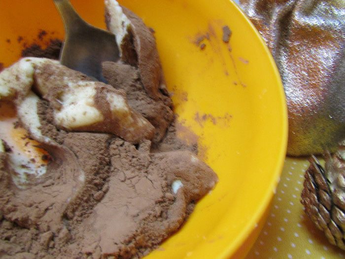 Отделить от теста 1/4 часть и добавить какао-порошок.