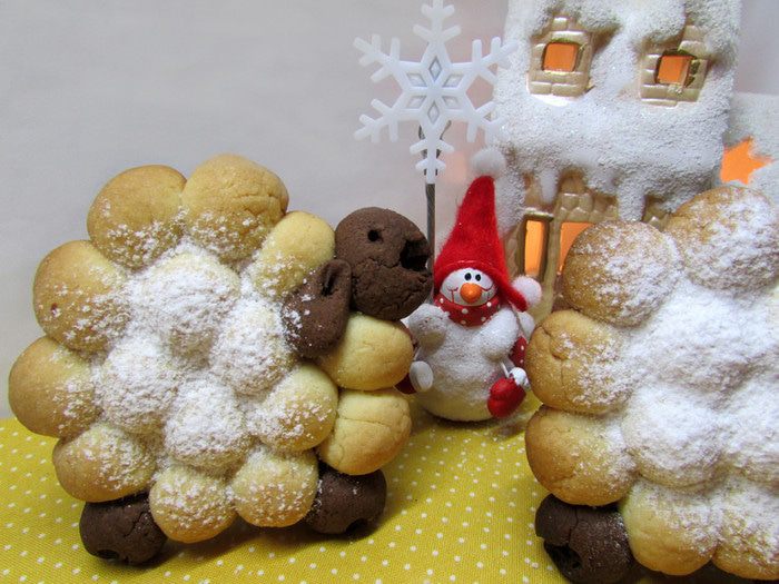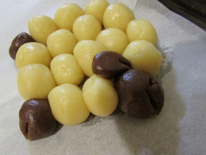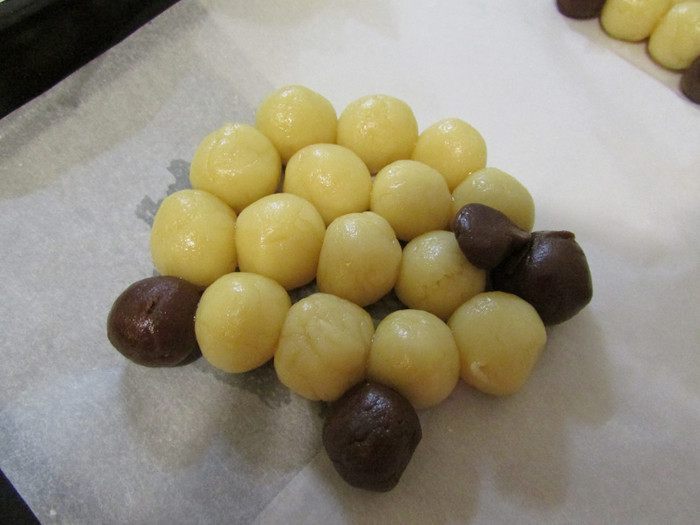 Из теста сформировать овечек. Для этого белое тесто отщипывать небольшими кусочками и скатывать шарики. Сформировать из шариков туловище, а из шоколадного теста — голову, ухо и ноги.