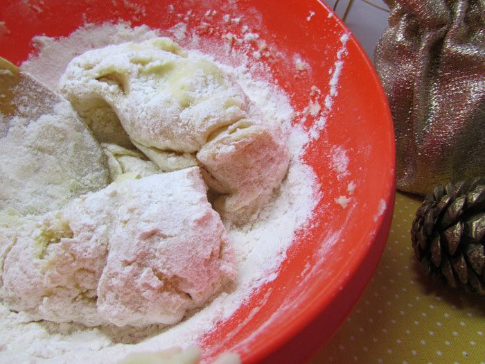 В другую часть добавить остальную муку.