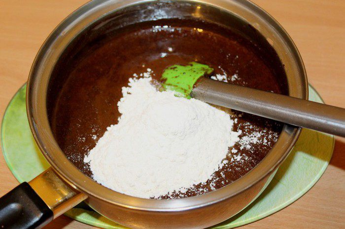 Муку, разрыхлитель и соду смешать. Просеять в 2 этапа к шоколадной смеси.