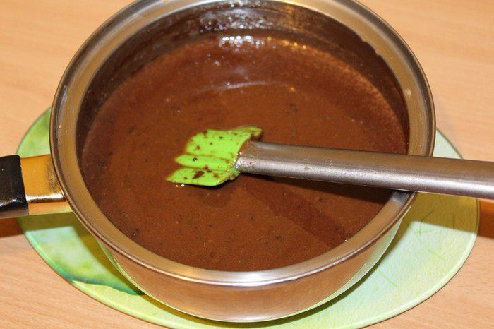 Молоко, масло, шоколад, какао и сахар на среднем огне довести до однородного состояния. Не доводить до кипения.