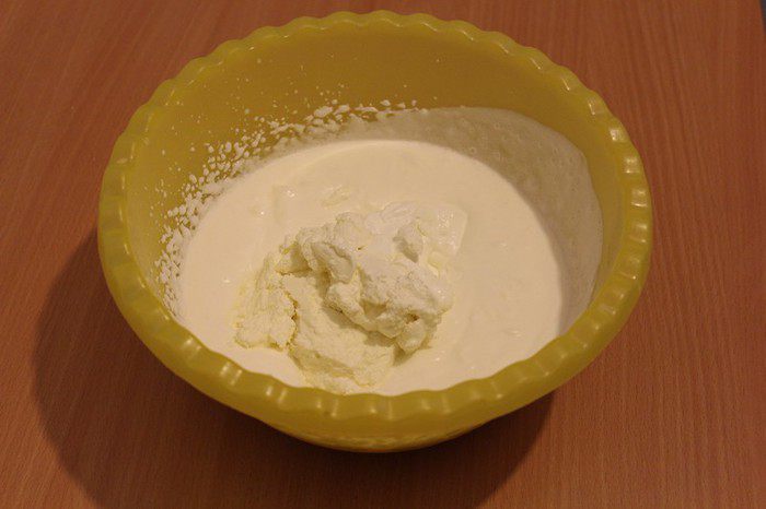 Добавить сметану, творожный сыр, сахар и еще раз взбить.