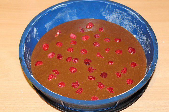 Выложить в форму 24 см половину теста. Затем выложить малину.