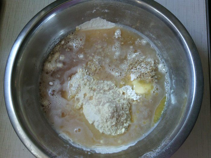 В большую миску просейте пшеничную муку, добавьте два других вида муки, воду, соль, патоку, дрожжи, растопленное сливочное масло, лимонный сок - замесите тесто. :)