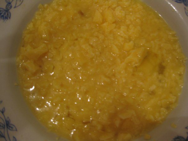 Взбить яйца и потереть мелко сыр. Все перемешать.