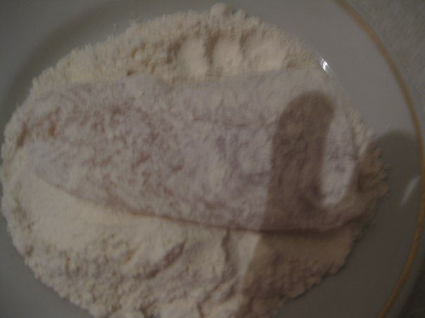 Рыбу обвалять в муке, потом в яично-сырной смеси.