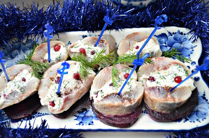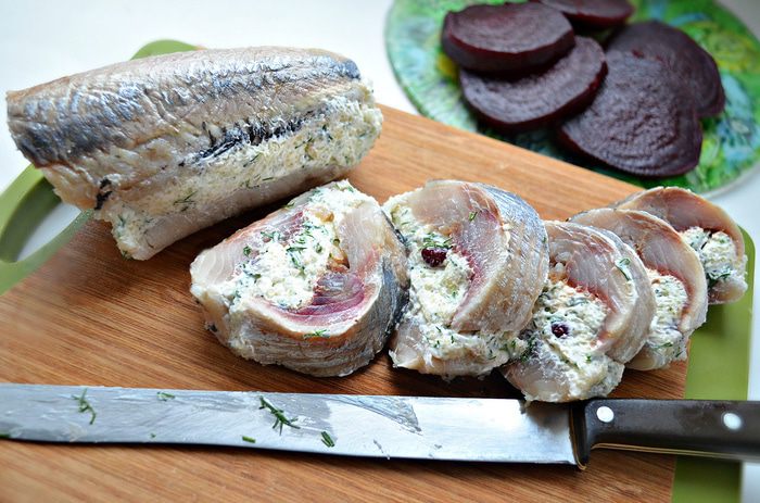 Ну что за праздник без малосольной селёдочки?! Хочу предложить вариант интересной закуски. Её можно приготовить заранее и, уже непосредственно перед накрытием стола, нарезать и подавать.
