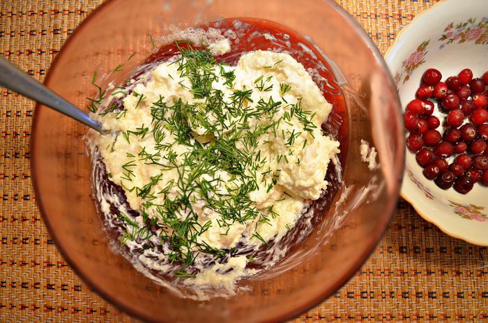 Добавляем клюкву, желатин и порубленный укроп к сырной массе. Хорошо перемешиваем.