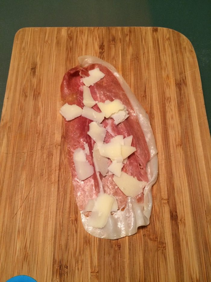 На лист прошутто овощечисткой тонко нарезать сыр.