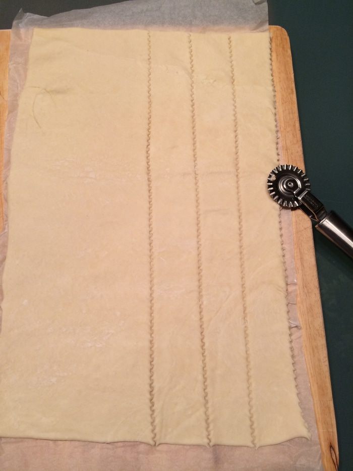 Слоеное тесто раскатать тонко и нарезать на ломтики 3-4 см.