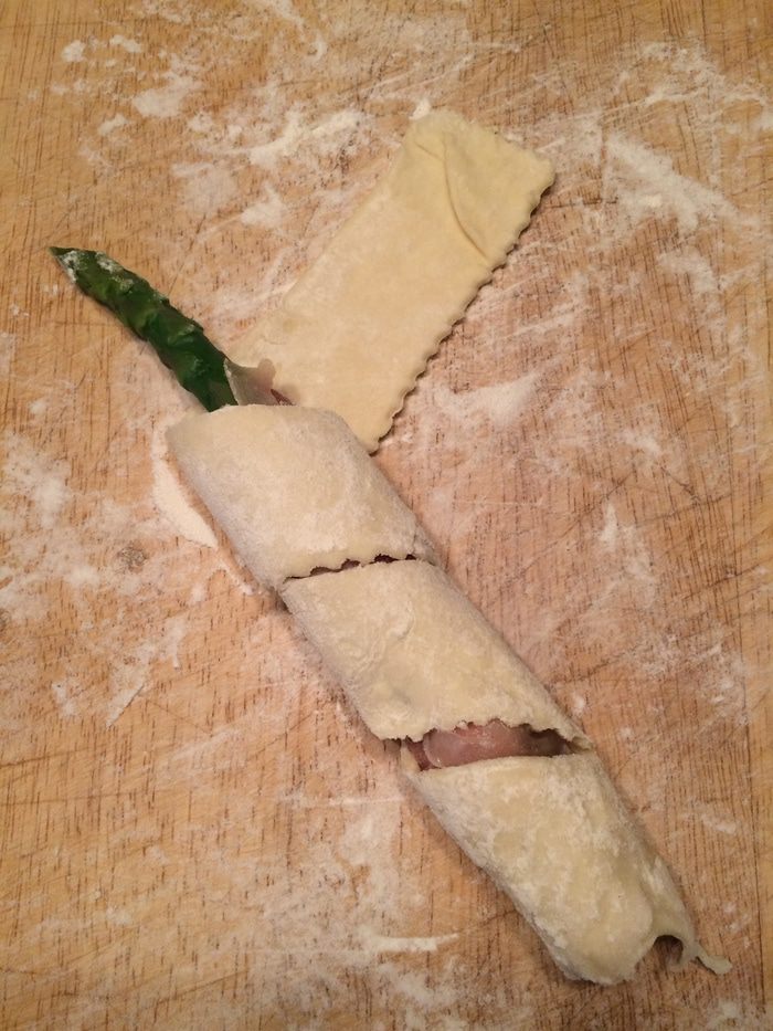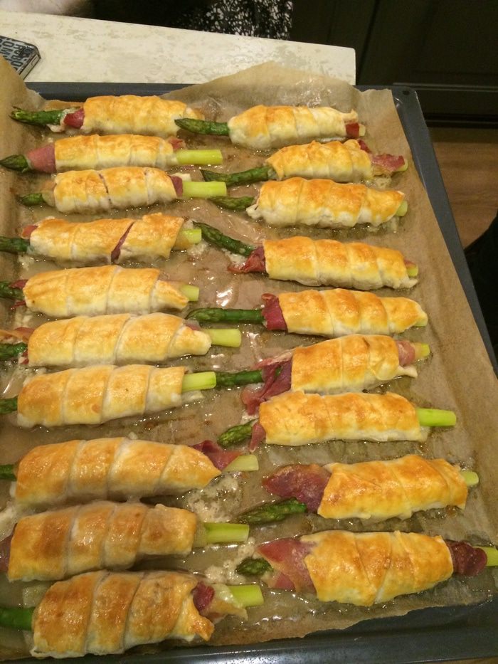 Всю красоту- вкусноту завернуть в ломтик слоеного теста, снова скрутить, свертеть.