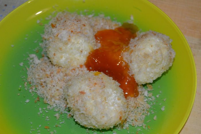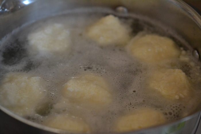 Ставлю кастрюлю на плитку, наливаю где-то 2 л и кипячу. Когда вода закипает, из творожной массы мокрыми руками леплю шарики (диаметром где-то 4-5 см). И кидаю их в кипяток. Осторожно помешиваю, чтобы не прилипли к дну. Через минут 5 гамбовцы всплывают, после этого даю им поварится еще 5-7 минут и вынимаю шумовкой в тарелку.