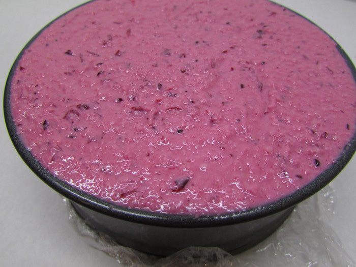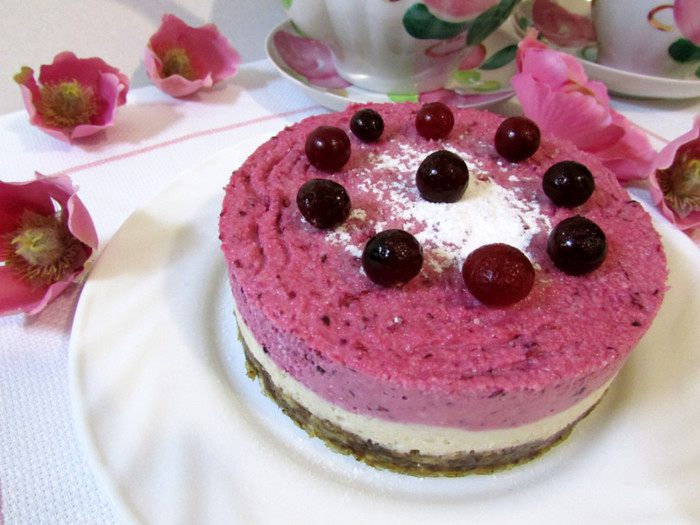 Выложите ягодный слой поверх белого и отправьте форму в морозилку, пока тортик не затвердеет.