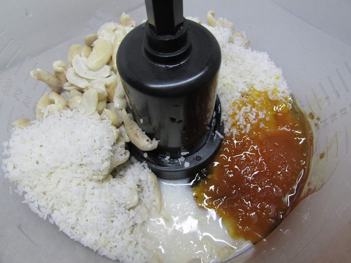 Кешью откиньте на дуршлаг, чтобы стекла вода. Затем в чашу блендера выложите кешью, молоко, кокосовую стружку, лимонный сок и мед. Хорошо смешайте до однородного крема.