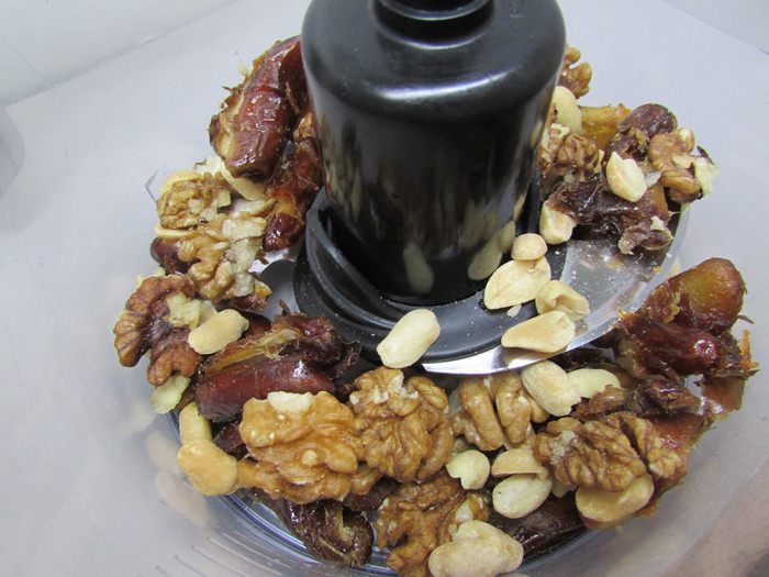 В чашу блендера выложите смесь орехов (грецкие и арахис), добавьте финики и измельчите.