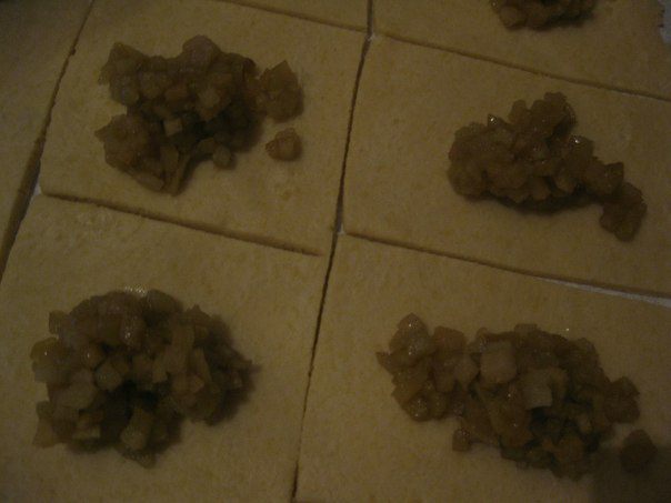 Раскатать из теста пласт толщиной 0,5 см и разрезать на квадраты. Разложить начинку, защипать пирожки и смазать топленым маслом.