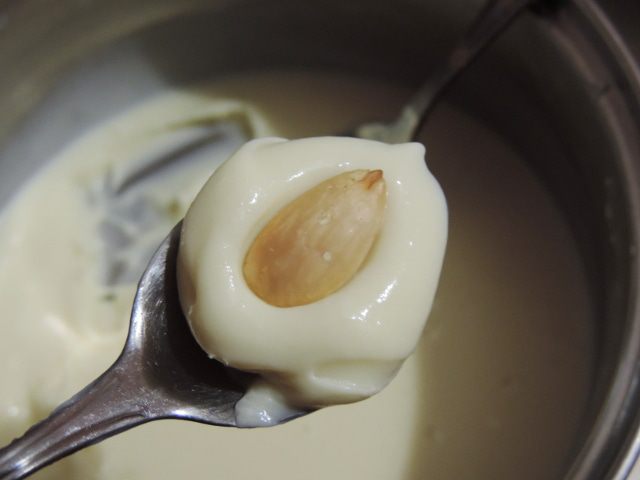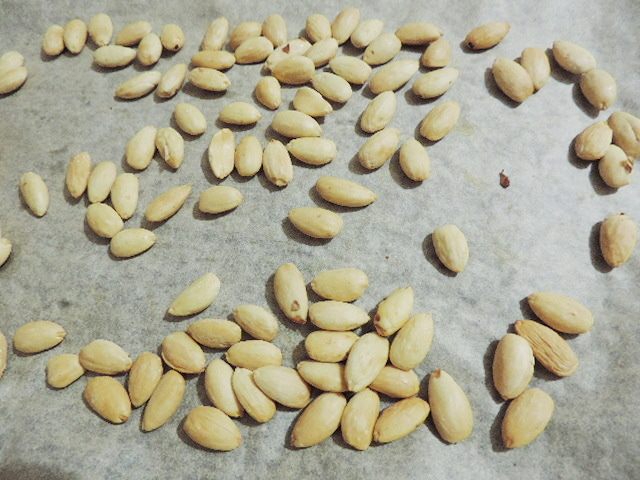 Самым первым делом подготовим миндаль. Это можно сделать и заранее. Заливаем миндаль кипятком и оставляем минут на 5. Затем воду сливаем, а миндаль теперь легко очистить от кожицы, просто сдавив его пальцами. Очищенный миндаль отправляем в разогретую до 150 градусов духовку. Там он должен пробыть до того времени, когда начнет становиться золотистым. Точное время зависит от вашей духовки. Мне понадобилось чуть больше 10 минут. Главное - не пережарить миндаль))).