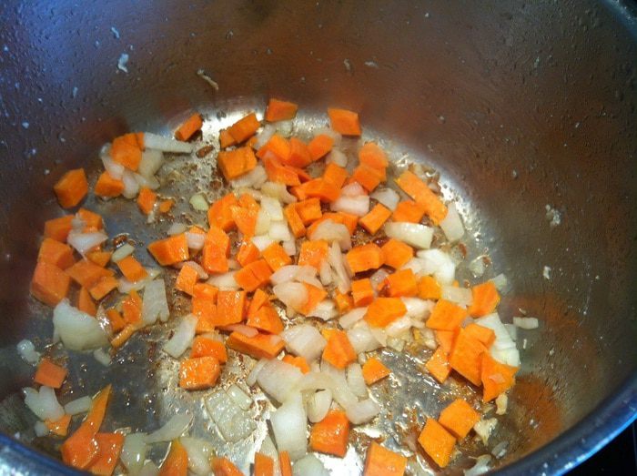 При необходимости добавьте еще 1 ст л масла, добавьте лук и морковь и пассеруйте 2-4 минуты.