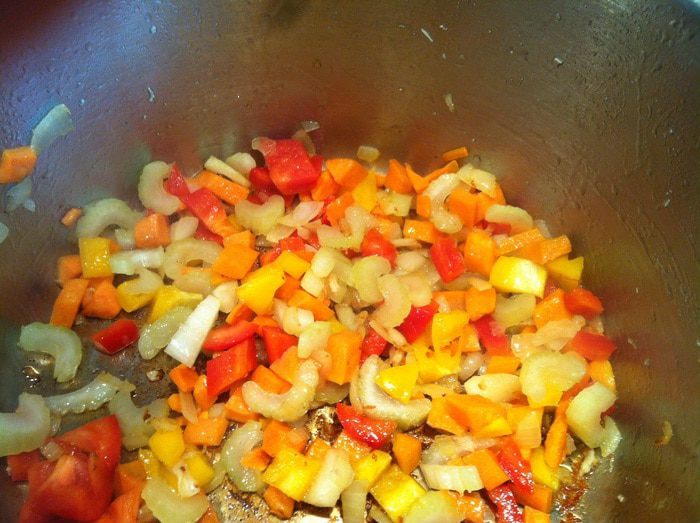 Добавьте болгарский перец и сельдерей, и обжаривайте еще 2 минуты.