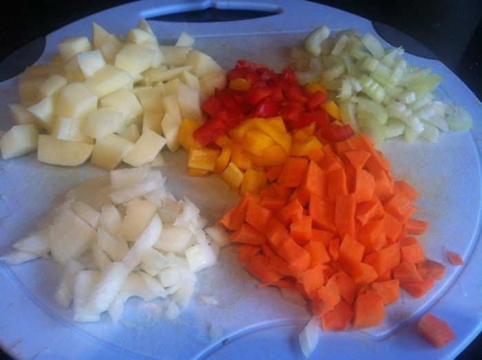 Почистите картофель, лук и морковь, у болгарского перца удалите семена. Тонко нарежьте сельдерей, лук - помельче, а картофель, морковь и болгарский перец - кубиком.