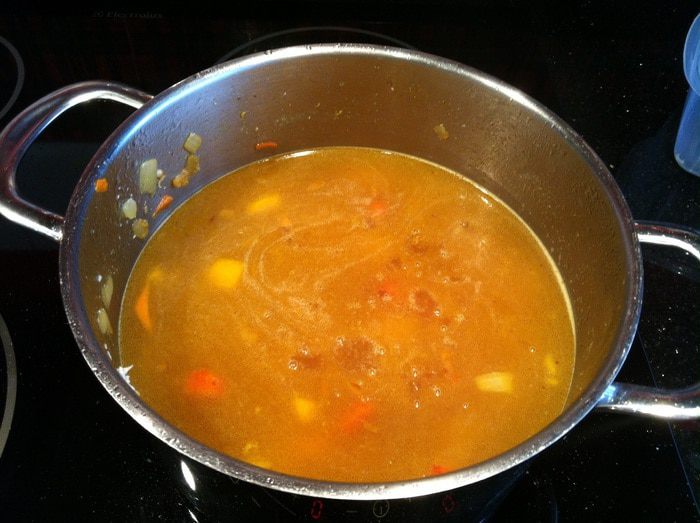 Залейте горячей водой (у меня 2 л), добавьте картофель и доведите до кипения.