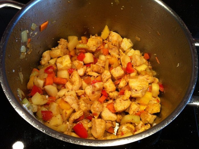 В кастрюле с толстым дном (или сковороде) разогрейте 1 ст л растительного масла, и обжарьте курицу. Выложите.