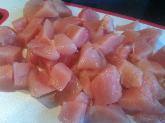 Куриную грудку помойте, обсушите бумажным полотенцем, и нарежьте небольшими кусочками.