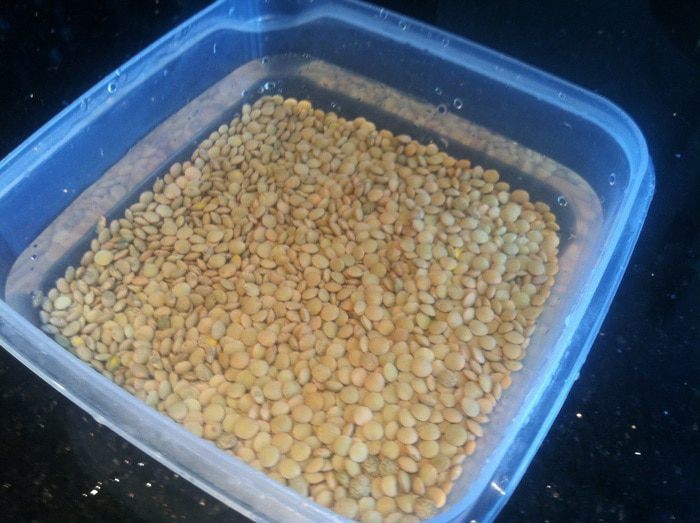Чечевицу промойте, залейте холодной водой и оставьте на 10-15 минут.