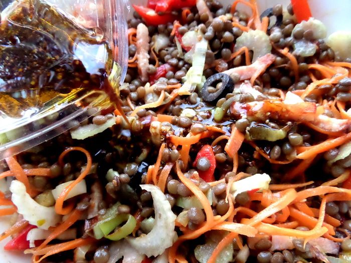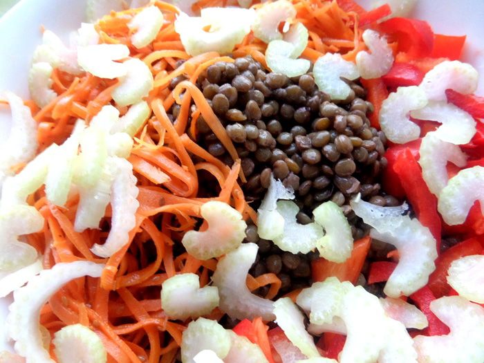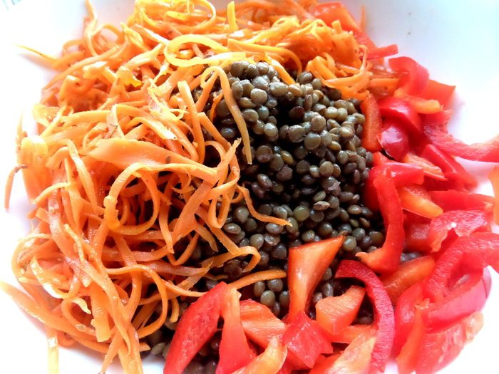 Чечевицу заранее отварить с солью или,если салат будет тёплым,варим непосредственно. Лучше брать бурую чечевицу,она не так разваривается.